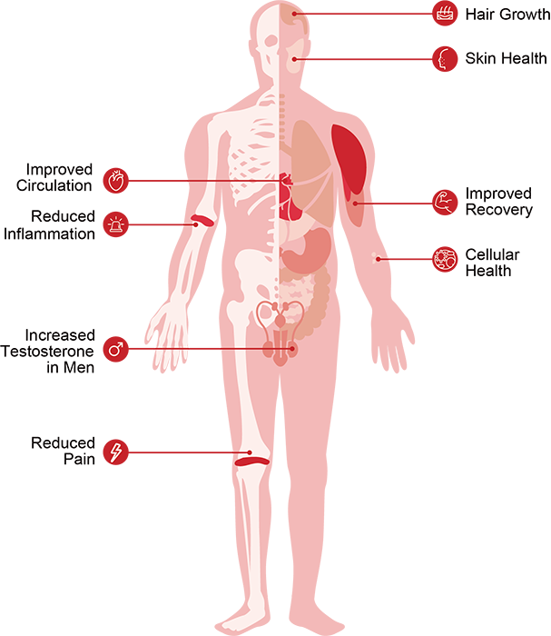 刺激毛囊中的干细胞以促进活跃生长 产生胶原蛋白 增加组织修复 减少细纹、皱纹和疤痕 刺激胶原蛋白的产生 强化头发并改善皮肤弹性 促进结缔组织健康 扩张血管以增加流量 保护红细胞和血小板 加速肌肉修复 刺激线粒体和干细胞以加快恢复速度 舒缓肌肉酸痛、关节疼痛和关节炎 缓解与自身免疫性疾病、脊髓和脑外伤相关的症状 增加睾丸激素的产生 可能会刺激大脑的松果体 缓解关节僵硬和酸痛 减少炎症 减少肌肉痉挛并增加血流量红光疗法的好处