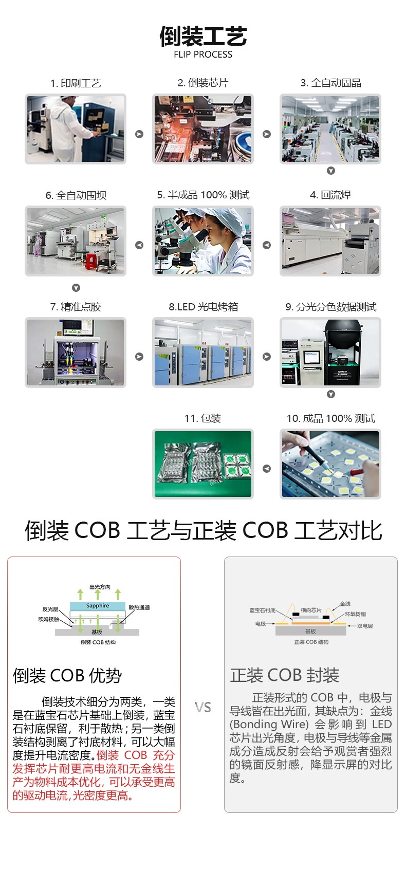 高光效:倒装芯片(Flip-Chip)直接与基板焊接,减少导线电阻,提升散热能力和电流承载,光效可达150-200 lm/W。