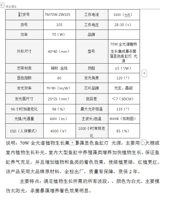 说明:70W全光谱植物生长集成暴藻显色鱼缸灯 光源,主要用于大棚或室内植物生长补光,