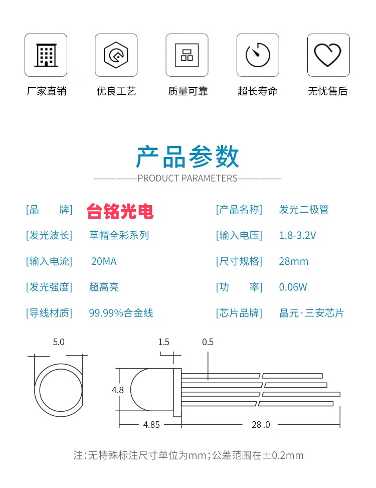 • 尺寸:直径5mm,圆头直插式。