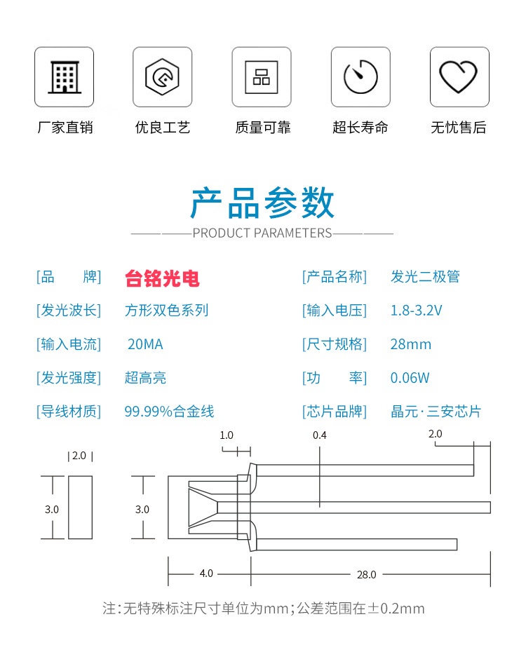 • 使用前确认电压/电流参数(如2V/20mA),需串联限流电阻。
