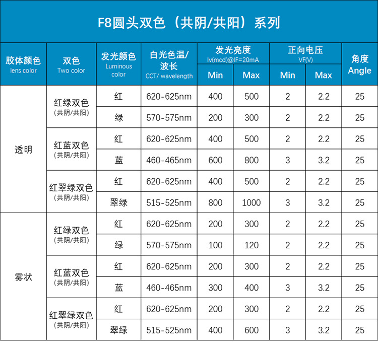 F8/8mm圆头双色LED灯珠(im电竞光电)产品说明