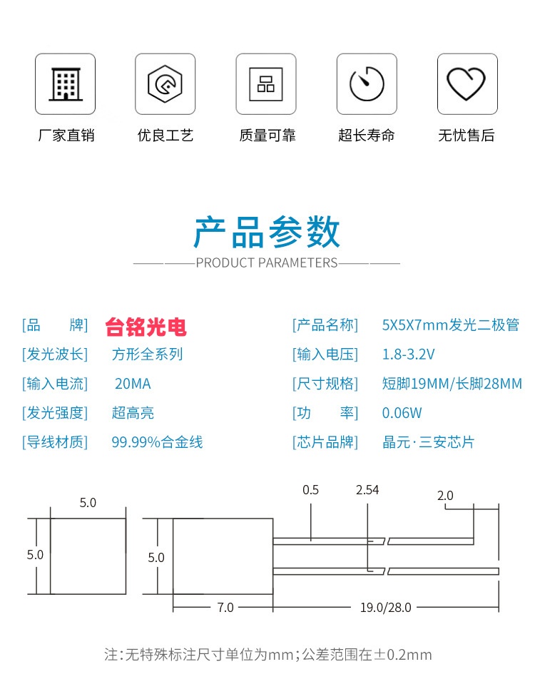 5X5X7mm方形长脚短脚 红蓝黄绿高亮直插LED指示灯珠 立即咨询