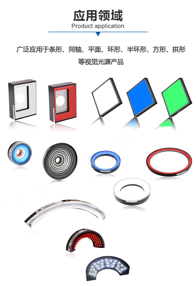 应用范围:条形、面板、同轴、环形、四面可调视觉光源產品、高端数码应用、电子产品应用、家用电器应用、信号指示应用、仪器仪表应用、工业照明应用。