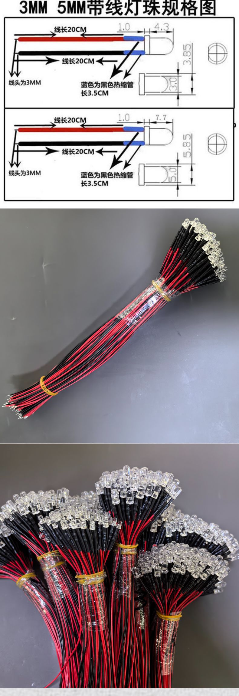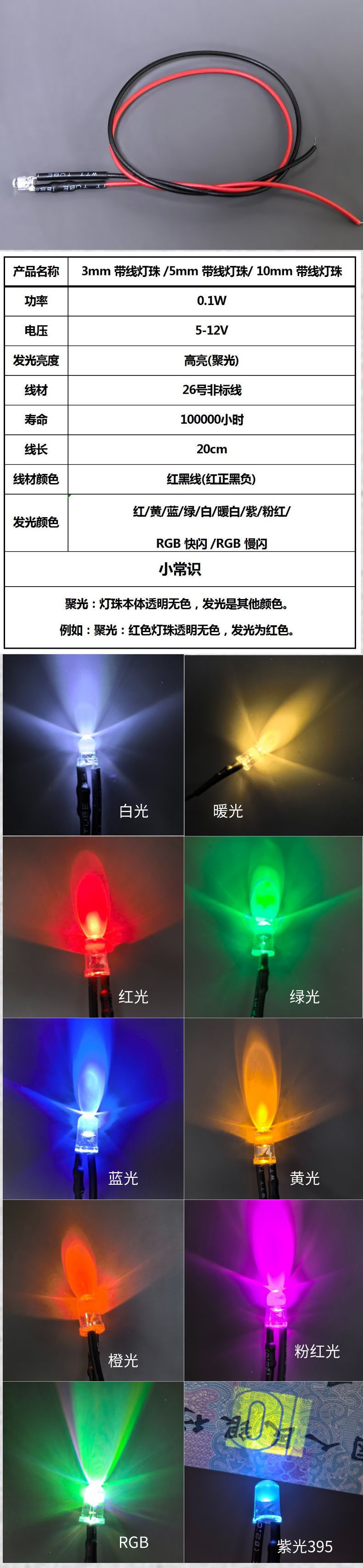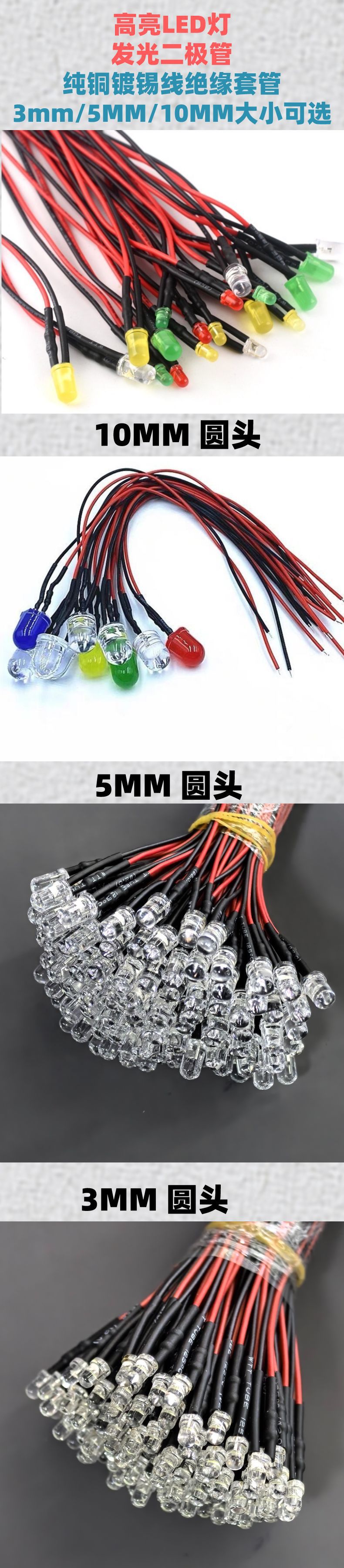 3MM/5MM高亮LED灯发光二极管5V12V带线LED灯珠小灯泡玩具车指示灯